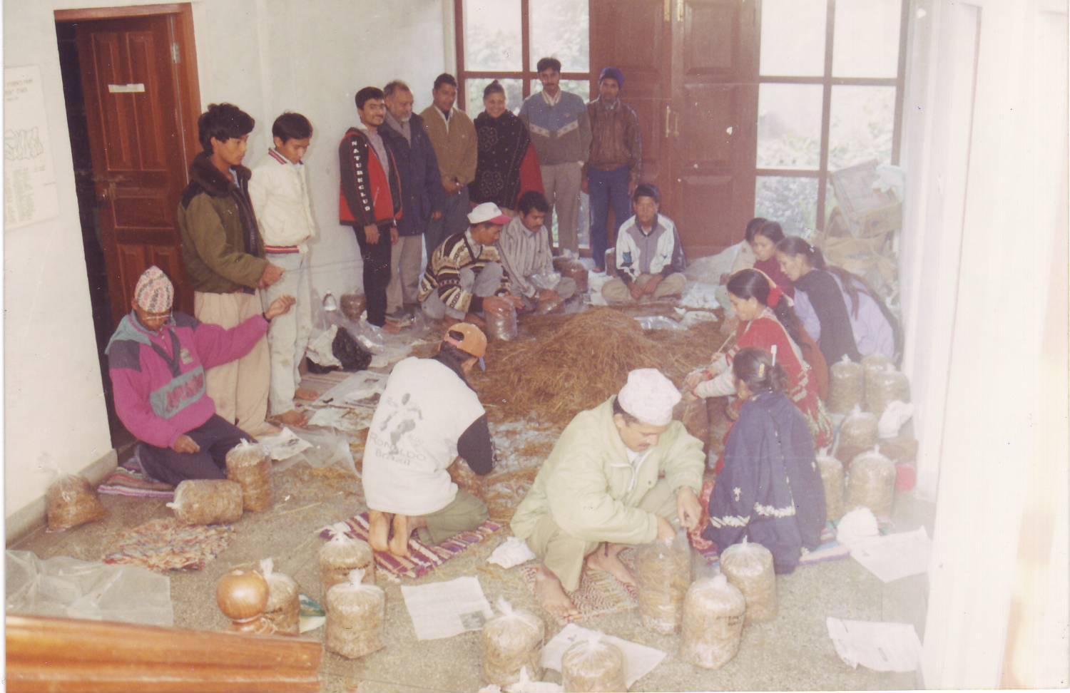 Post-cocoon training of serifarmers - preparing packets for mushroom seeds